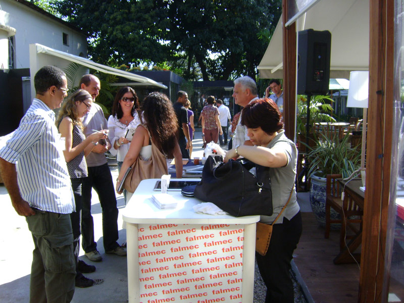 Na mesa estavam presentes: Peri Cozer Olhovetchi, Diretor-Presidente da Falmec do Brasil; Cláudio Magalhães, Coordenador do Laboratório de Gestão em Design da PUC-Rio; Arlena Montesano, Coordenadora de Desenvolvimento de Mercado de Construção Civil da ArcelorMittal e os designers Leonardo Lattavo e Pedro Moog.