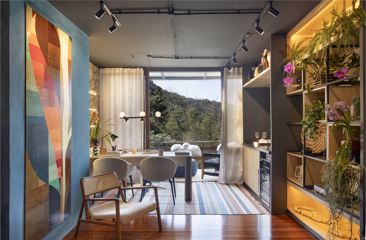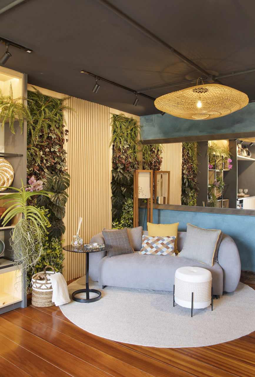 Um escritório voltado para o conceito biofílico. A união da pedra nas paredes com o piso de madeira e o painel do jardim vertical proporcionam o aumento da criatividade e a redução do estresse e da ansiedade do morador.