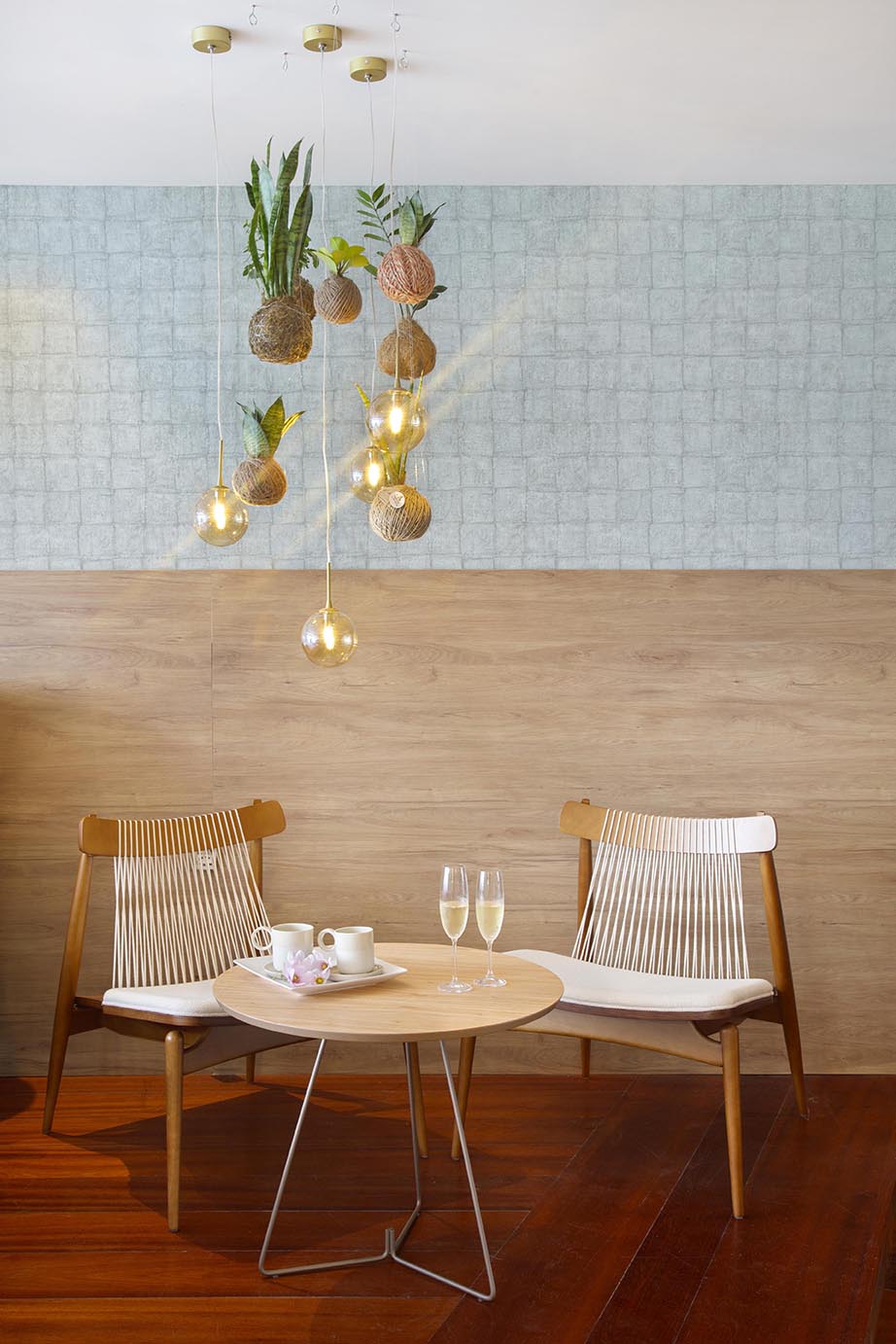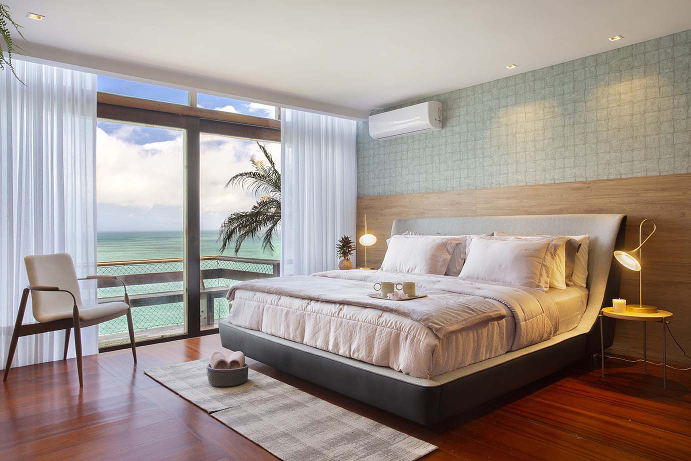 Inspiração natural para o projeto que contempla a localização geográfica da casa, a partir da união do mar e do mato. O espaço apresenta o verde para dentro do quarto através de diversas coquedamas e traz o mar representado por vasos azuis.