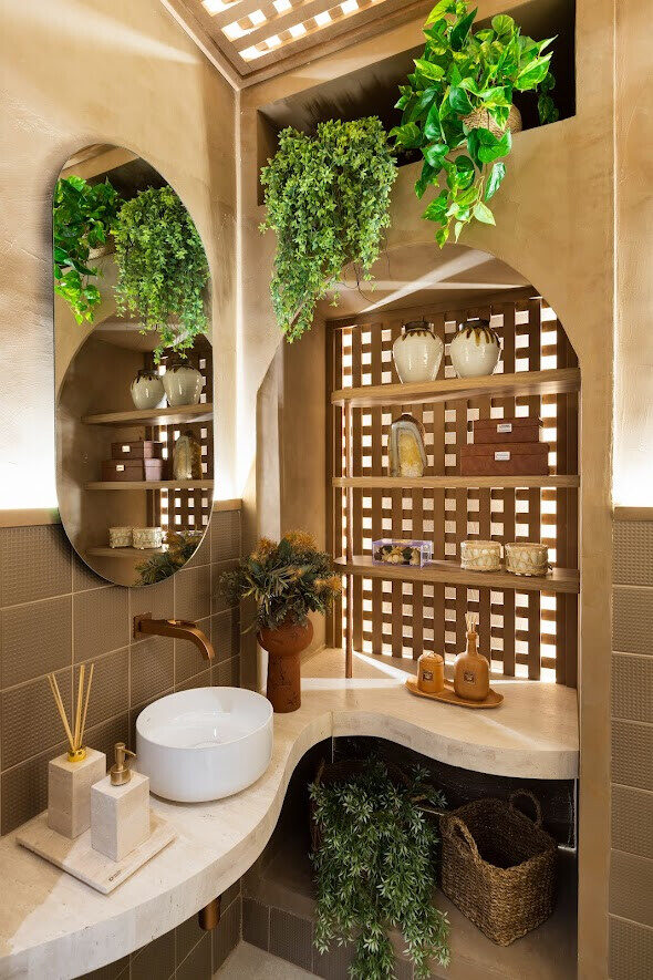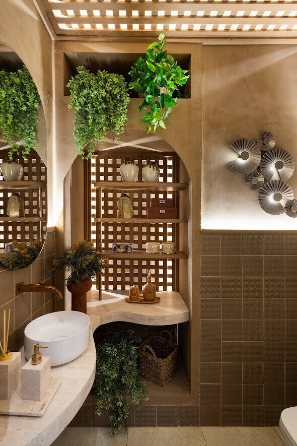 Com a premissa de personalização, nosso lavabo incorpora esse conceito em diversos detalhes. Destaca-se uma bancada orgânica cuja forma se adapta perfeitamente ao espaço, além de uma arandela exclusiva, projetada pelo escritório e confeccionada pela Lumina Light.