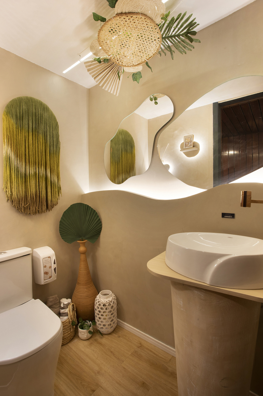 Curvas, feminilidade e brasileirismo ditam o Lavabo de Bamba. A partir de revestimentos naturais com aspecto artesanal em formas orgânicas, o pequeno espaço é inspirado na neuroarquitetura para transmitir organicidade e fluidez. Uma homenagem à Mah Laranjeiras do @casadebamba101.