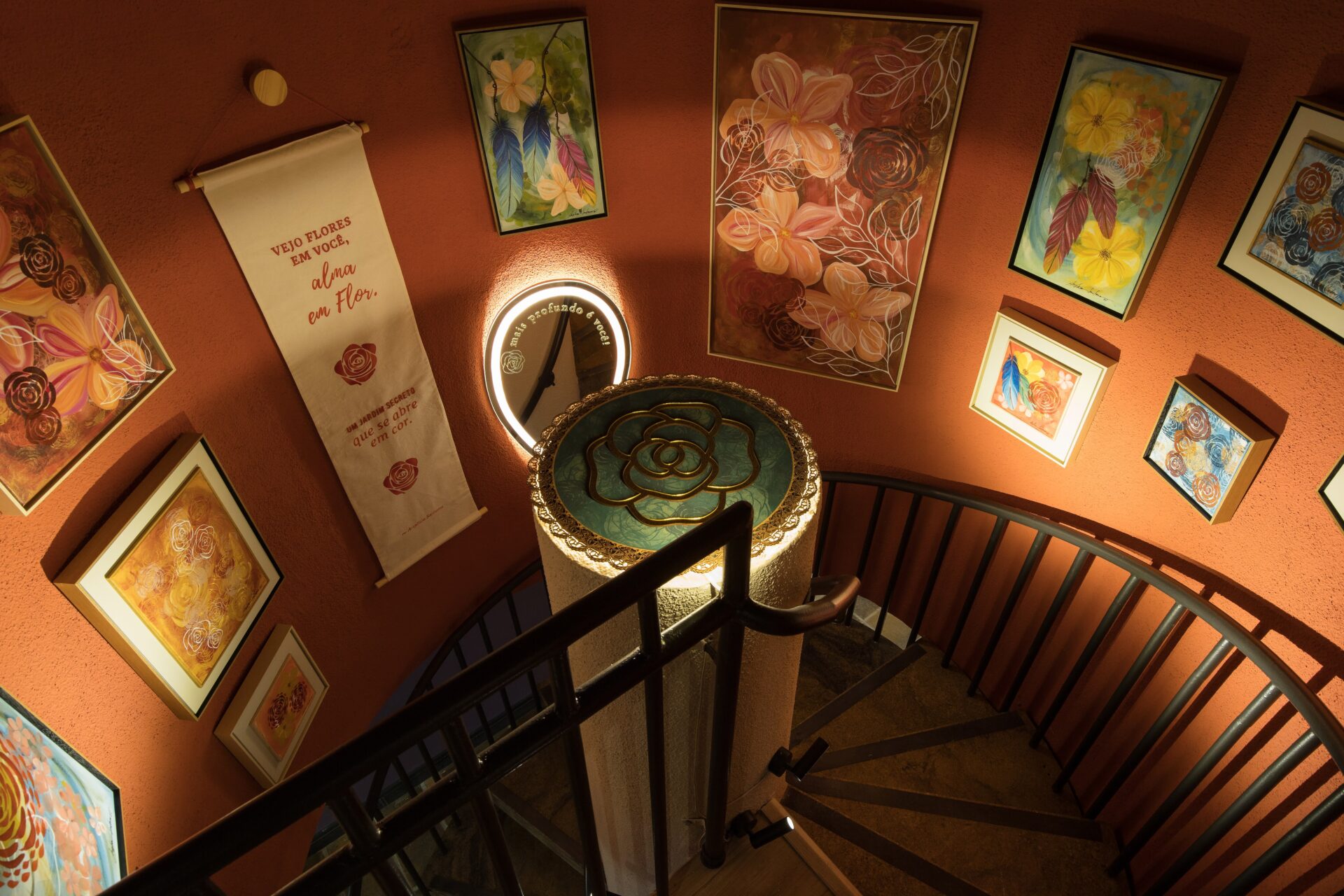 A Galeria Jardim Secreto convida à reflexão e à apreciação da beleza que encontramos na caminhada da vida. A escada central simboliza a transição entre diferentes dimensões, refletindo a jornada interna de cada um.