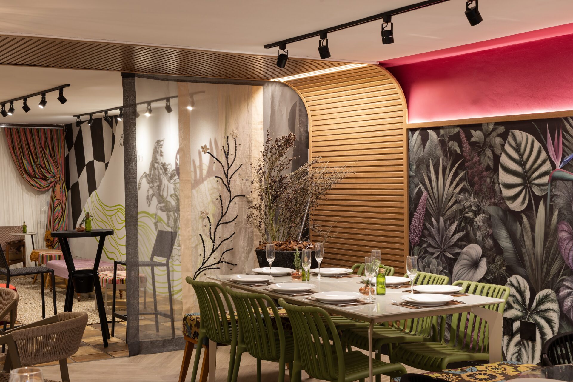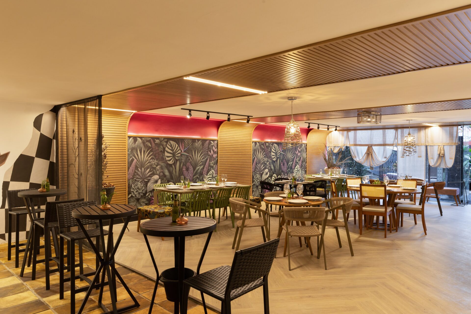 Curvas de MDF da Eucafloor desenham o teto. As cores da Suvinil vestem o espaço. Na parede, folhagens tropicais evocam o Brasil profundo. No Ripado’s, o menos ganha alma, o ambiente fala baixo e a beleza está em cada gesto. As cortinas revelam bordados que ganham alma poética ao espaço.