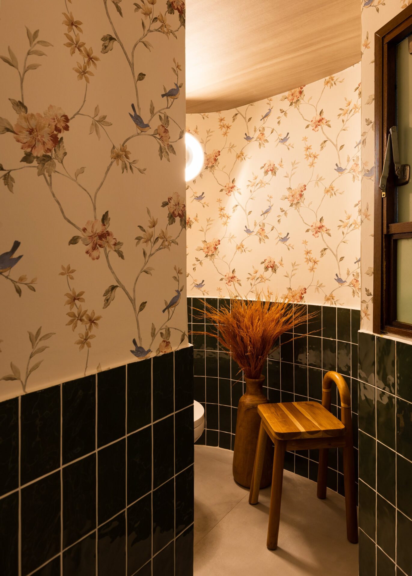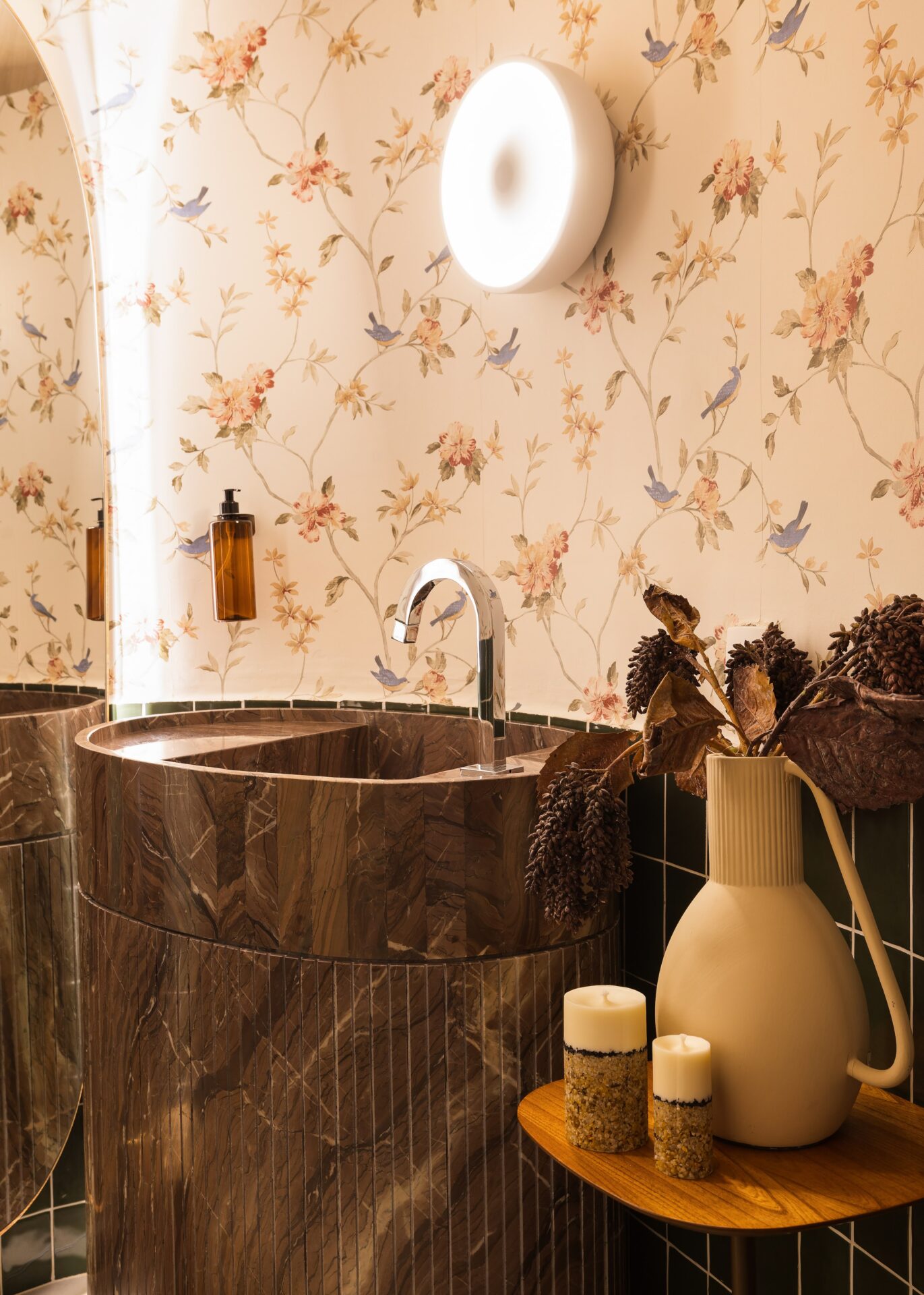 O verde das paredes lembra quintais vivos. O floral traz à tona memórias delicadas. O mármore e a madeira aquecem como matéria viva. É um espaço funcional, sim, mas é, acima de tudo, um lugar de lembranças.