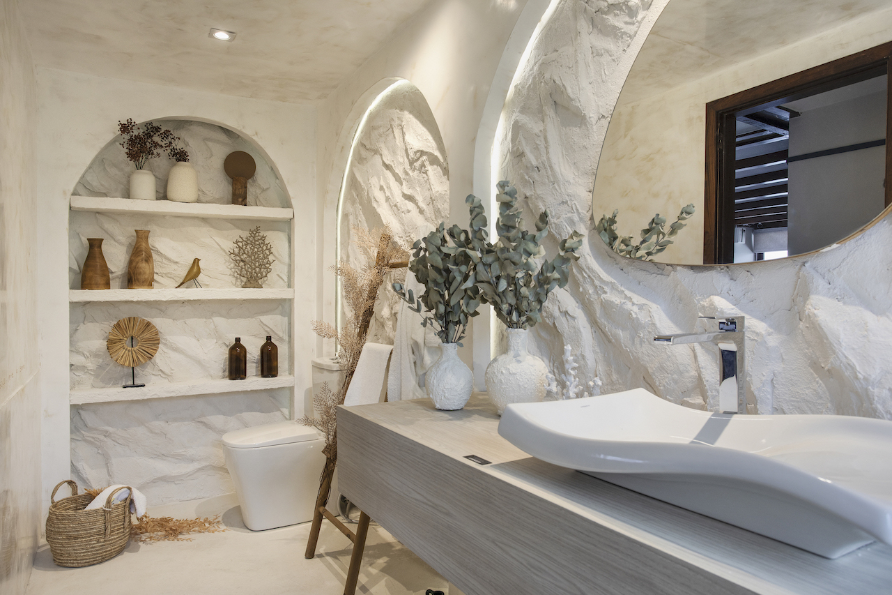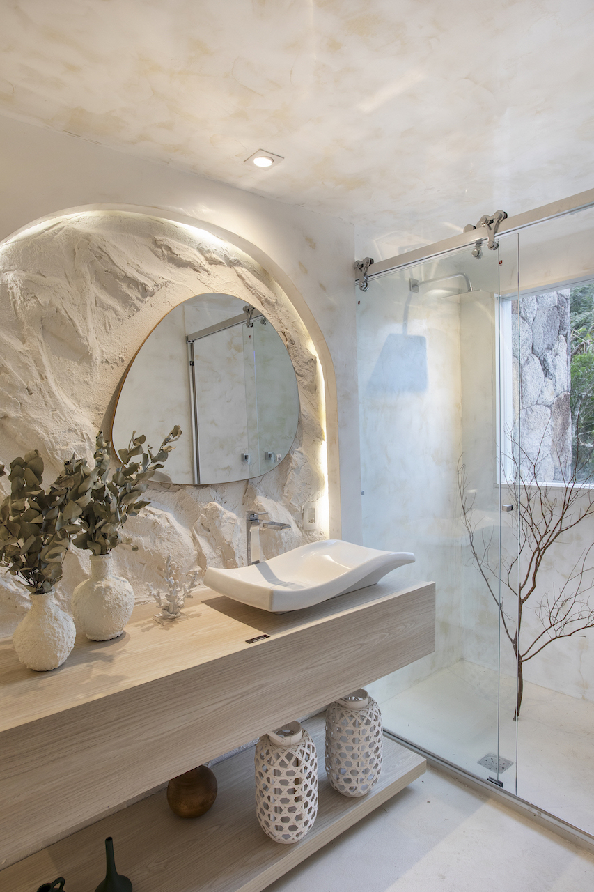 O luxo vem da natureza. Um banheiro sem obras, onde as sobreposições de materiais exaltam o ambiente. Destaque para a textura que remete à rocha e o uso de porcelanato líquido.