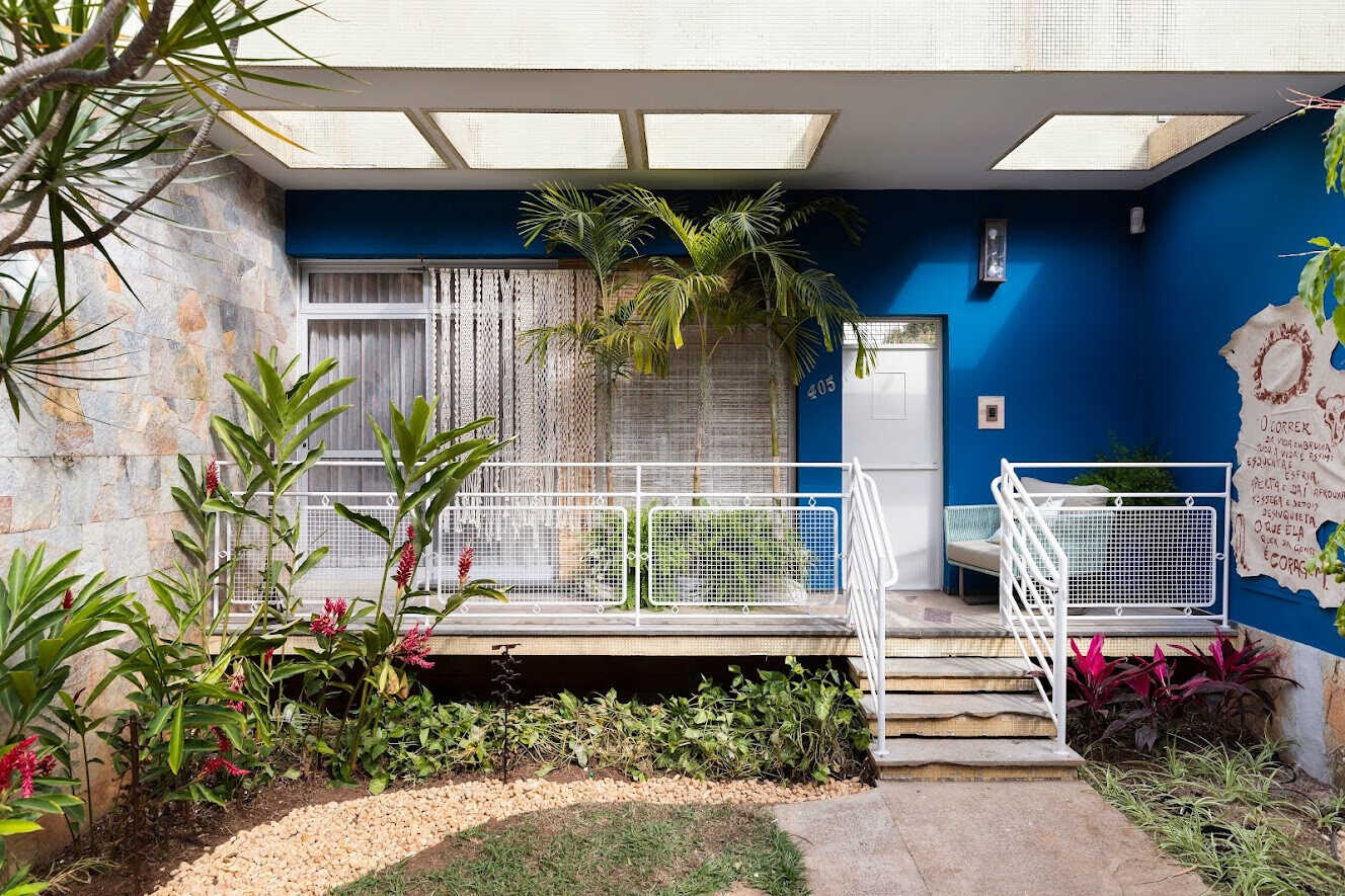 O jardim completa a atmosfera, assim como os vasos cerâmicos com plantas, que envolvem o ambiente em descanso e autenticidade.